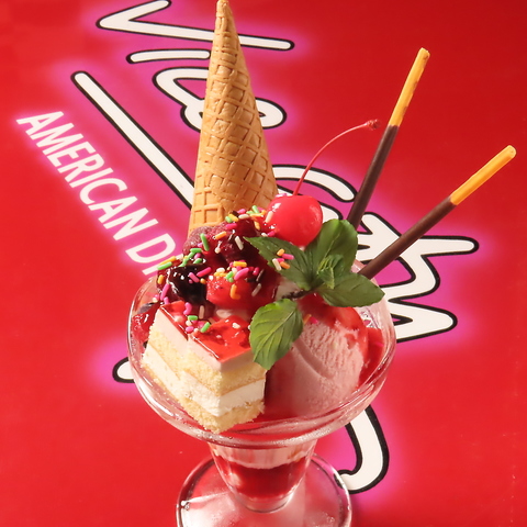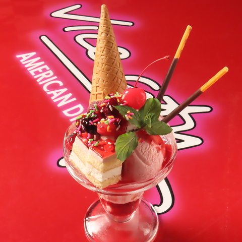 ポップな雰囲気が可愛い「アメリカンパフェ」は、食後のお口直しにもおすすめのデザート★ボリューム満点&トッピングは当店ならではのアメリカンな飾り付けで、見た目も華やか♪