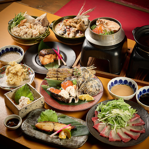 忘年会・新年会シーズンスタート!!旬鮮魚やブリを使ったちょっと贅沢なコースをご用意◎前菜3種から始まり、県産の魚を使った刺身盛り合わせに、鮮魚と地野菜の揚げ物、旬鮮魚を使用した焼き物、メインには〆まで付いた鰤しゃぶをお楽しみいただけます。3時間飲み放題も付いているので、ゆったりと魚料理とお酒をお楽しみください◎飲み放題のラストオーダーは、2.5hです。