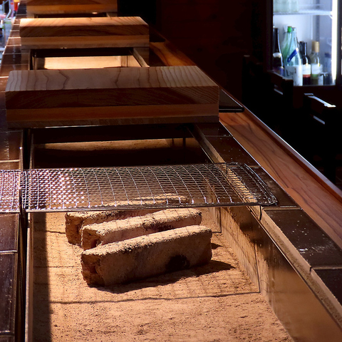 完全オーダーメイドの囲炉裏カウンター。お客様ごとに炭をご用意するので、気軽にそして自由に炭火焼きを!