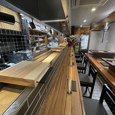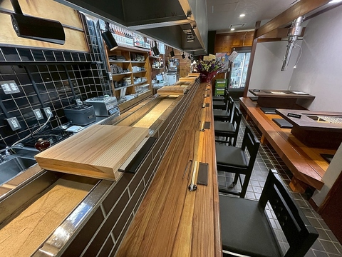 落ち着いた雰囲気の店内は、木のぬくもりを感じる上質な和空間。お一人様でも気軽に立ち寄れるカウンター席をご用意。目の前で繰り広げられる調理風景をお愉しみいただけます。ゆったりと寛ぎのひとときをお過ごしください。