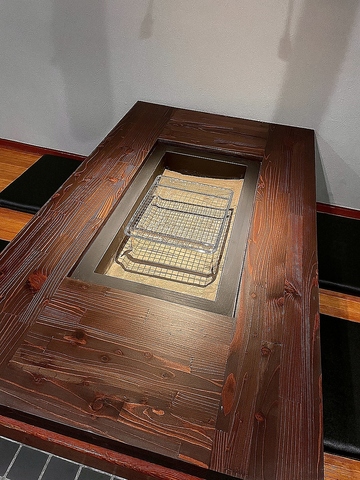 お席の中心に据えられた特注の囲炉裏。炎の揺らめきと香ばしい匂いが食欲をそそり、和の趣を感じる空間で、和気あいあいと炉端焼きを楽しめます。