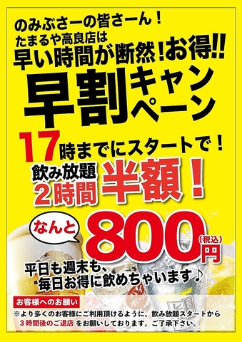 17時までにスタートで、2時間飲み放題がなんと半額!平日も週末も毎日開催してます♪