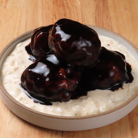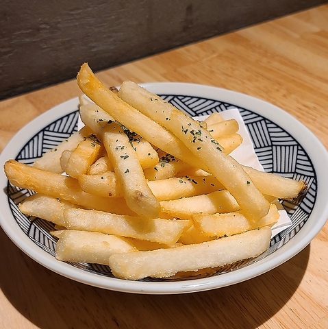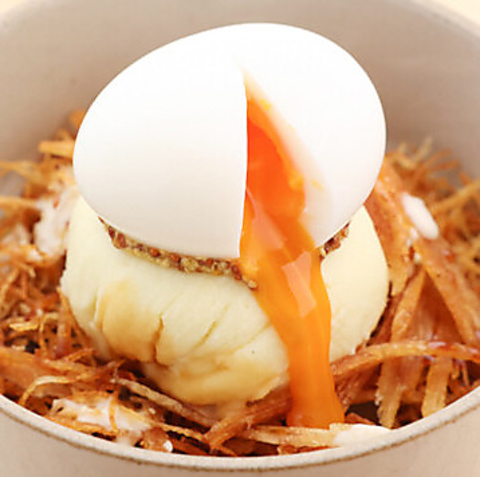 クリーミーなポテトの上に半熟卵をトッピング、甘めのタレがアクセント。卵を割ると、濃厚な黄身がとろりと流れ出し、まろやかさが増します。周りの揚げじゃがと混ぜ合わせながら召し上がって頂きますと、カリカリ食感の組み合わせも楽しめる一品です。