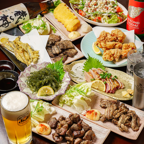 生ビールも飲み放題OK!充実の2時間飲み放題に、心惹かれる自慢の料理が盛りだくさん!豪快に焼き上げる炭火焼が2種類をはじめ、天ぷら、鶏カラ等、ボリューム満点のお料理が付いています。元気なスタッフが全力で接客しております!楽しいご宴会をぜひ当店でいかがでしょうか♪みんなで乾杯して、素敵な夜を迎えましょう!
