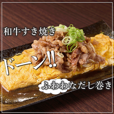 【出汁と和牛の夢コラボ!】ふんわり焼き上げた出し巻き玉子の上に、じっくり煮込んだ和牛すき焼きを贅沢にトッピング。甘辛い割り下が玉子の優しい旨みを引き立て、口いっぱいに広がる至福のハーモニー。お酒との相性も抜群な新定番を、ぜひご賞味ください。