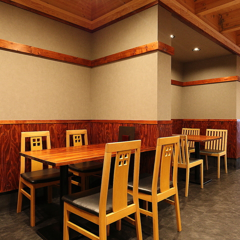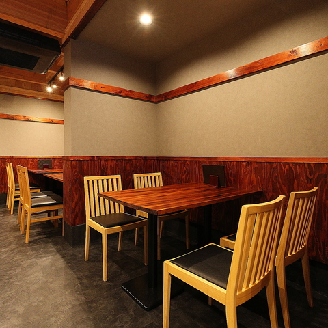 あたたかな木目とグレーの壁が調和した、落ち着いた和モダン空間。テーブル席は間隔も広く、隣を気にせずゆっくり過ごせます。