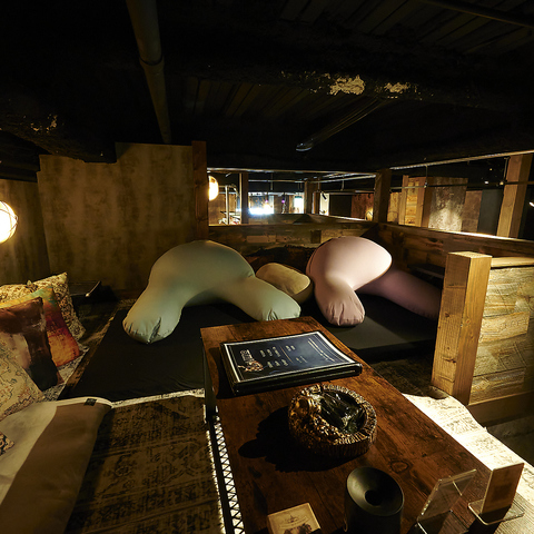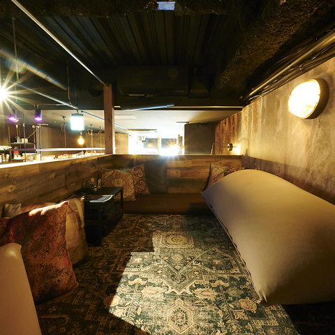 「アジト」をテーマにした秘密基地のような店内で、ヨギボーがあり靴を脱いで ゆったりくつろげます☆