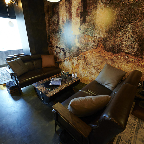 当店の内装は「アジト」をテーマにしており、まるで隠れ家にいるかのような特別な雰囲気を演出しています◎ドイツから取り寄せた高品質なクロスを使用し、壁面や装飾にこだわりを持っています。また、古材を活用した木材のデザインが、温かみと歴史を感じさせる空間を創り出しています☆