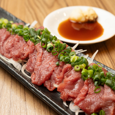 きめ細やかな赤身の柔らかさと、馬肉特有のさっぱりとした脂の甘みが堪能できる一品です。餃子居酒屋でありながら、鮮度抜群の馬肉を職人が丁寧にスライスし、シャキシャキの玉ねぎとたっぷりの薬味を添えました。濃厚な甘口醤油におろし生姜を溶かし、絡めて召し上がってください♪