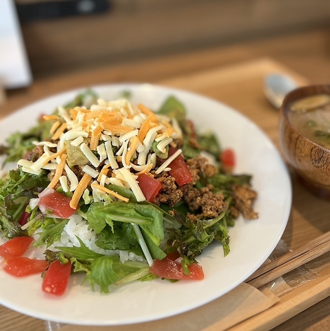 国産若鶏もも肉の塩こうじ焼きプレートは、柔らかい鶏もも肉を塩こうじでじっくりと漬け込み、ジューシーに焼き上げました。当店では、お味噌汁の具材をはじめ、全ての野菜に有機・無農薬野菜を使用しており、無農薬米を使用したご飯と共に、健康的な一皿をお楽しみいただけます。