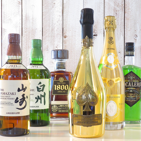 まるで本格的BAR。お酒の種類、品数は豊富にご用意しております。中々お目にかかれない「山崎」「マッカラン12年」や「アルマン・ド・ブリニャック」をはじめとしたシャンパンもご用意。オリジナルシャンパンもございます。詳細はお問い合わせ下さい。