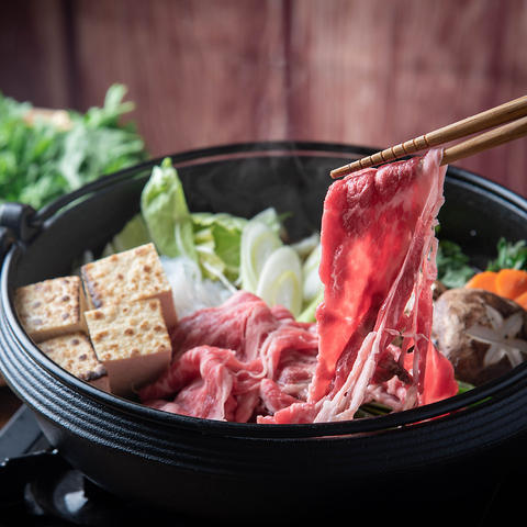 上品な旨みがとろける黒毛和牛。極上の脂が鍋全体を包み込む至福の味わい。三元豚も食べ放題でご用意