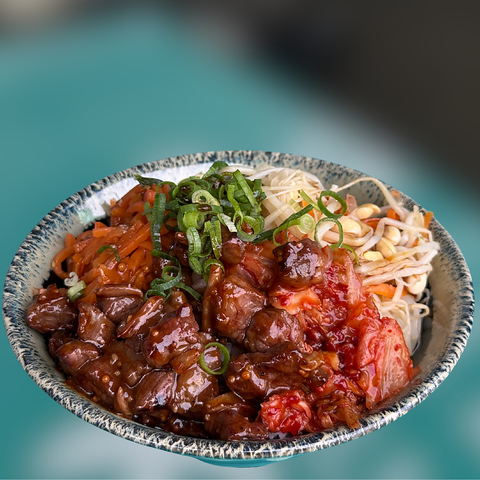 熱々のライスの上に、丁寧に焼き上げたジューシーなカルビ肉を贅沢にトッピング。シャキシャキとしたもやし、ほうれん草、人参などの新鮮なナムル。食べる前から期待感を高めます。