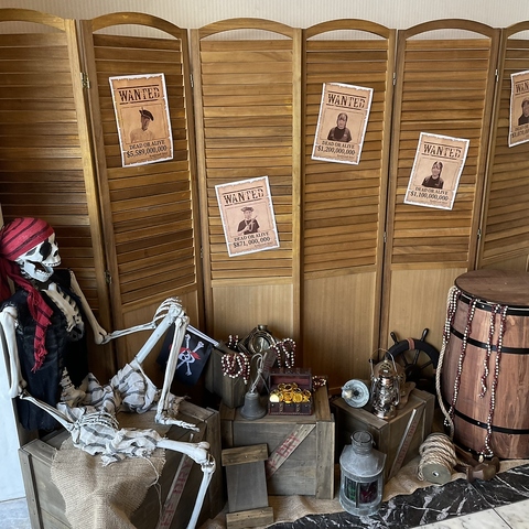 「海賊になりきって記念写真★コスプレフォトコーナー」店舗入り口に海賊コスプレアイテムを取り揃えています。衣装や小物を使って、本格的な海賊に変身し、楽しい記念写真を撮影しましょう!思い出に残るひとときをお楽しみください。