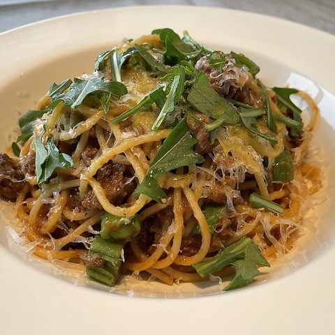 猪と鹿肉をミンチし、香味野菜と合わせじっくりと煮込んだボロネーゼに。パスタと合わせた後、仕上げに自家製のデミグラスソースと絡めた上品な味わいの逸品。