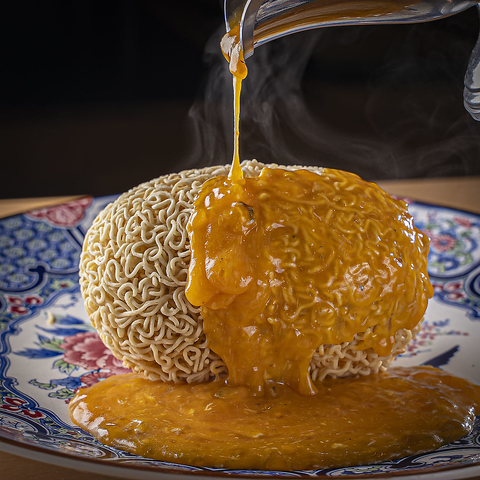 球体のような形状が印象的な、当店看板メニュー『金の皿うどん』。見た目のインパクトだけでなく、味わいも絶品!パリパリの麺に絡む濃厚なソースが食材の旨味を引き立て、一口食べればやみつきになる味わい☆色とりどりの野菜が彩りを添え、目にも楽しい一皿です。シェフのこだわりが詰まった逸品を是非…。