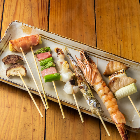 海鮮を使った串焼き・新鮮な食材を体に優しい油で揚げた串揚げを豊富にご用意しております!当店おすすめのメニューを提供するおまかせ10本盛りはお連れ様とシェアもできるので大変人気です♪