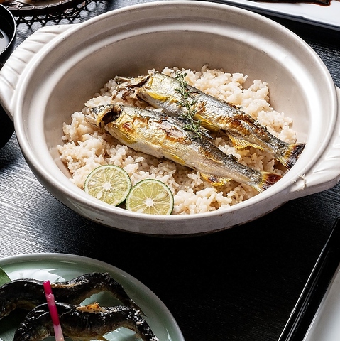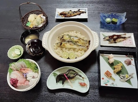 八寸、鮎のつみれ汁、お造り(鮎の刺身等)、鮎の有馬煮、鮎の塩焼き、鮎の田楽、鮎の炊き込み御飯、天麩羅五種盛(鮎の梅しそ天麩羅他)、香の物、水菓子