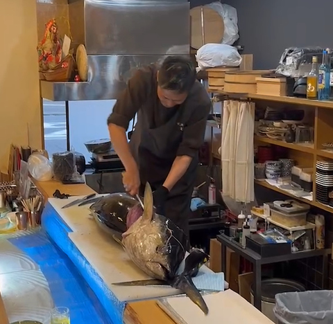 店主自らマグロを釣り、店内や施設でマグロ解体ショーを開催!