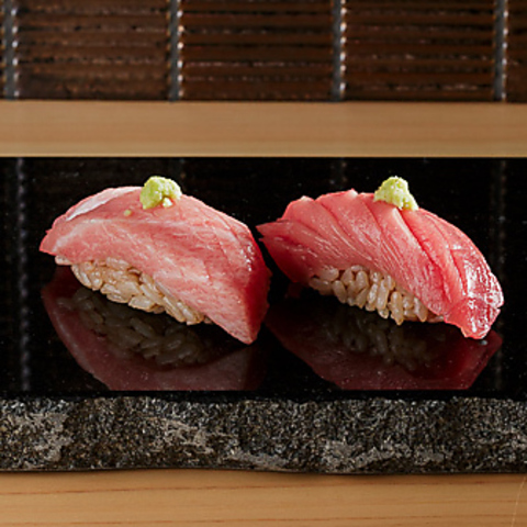 ネタの種類や状態により、それぞれ異なる熟成期間、確かな目利きでその熟成度合いを見極め、最も適したタイミングでお客様にご提供しております。独自のブレンド米と赤酢を合わせ少し硬めに仕上げたシャリもまた、素材の旨味を最大限に引き立てています。ぜひご堪能ください。