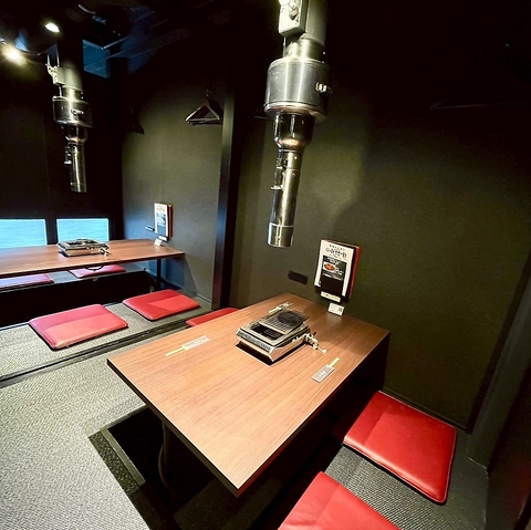 しっぽりとオトナの焼肉。隣の席とはゆったり目でスペースとっております。スパイラルダクト完備なので、煙も気になりません。個室は人気のため要予約です。