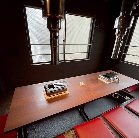 しっぽりとオトナの焼肉。隣の席とはゆったり目でスペースとっております。スパイラルダクト完備なので、煙も気になりません。個室は人気のため要予約です。