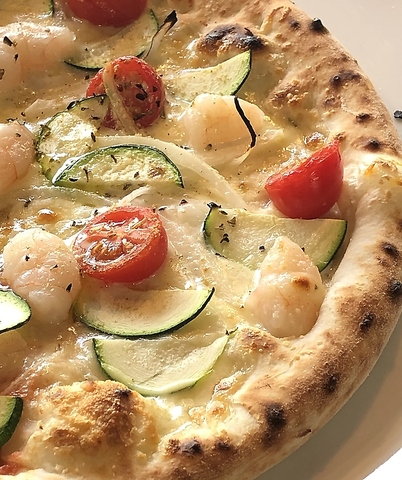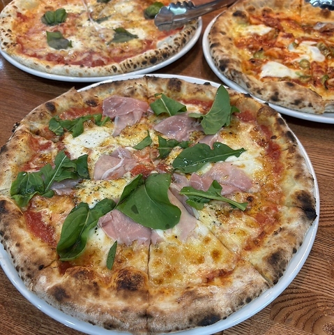 真っ赤な特注ピザ窯を使い400℃の高温で一気に焼き上げます。表面はカリッと香ばしく、中は驚くほどもちもちの食感です。