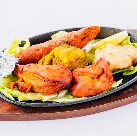 タンドリーチキン1個、手羽先1個、チキンティッカ1個、タンドリープラウン1個、ガーリックティッカ1個、マライティッカ1個、シークカバプ1個