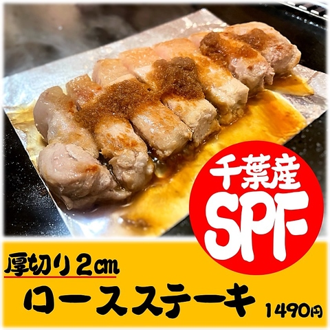 豚の飼育において“内屈指”の千葉県北東部にてストレスなく育った豚は筋肉質で水分保有率が高くやわらかな肉質。また、その甘みのある脂も特徴。自家製ジンジャーソースで厚さ2cmの厚切りロースステーキ!