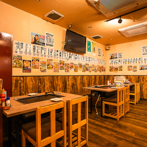 木の温もりを感じる落ち着いた雰囲気が魅力のテーブル席。鉄板が備えられ、自分で料理を楽しむスタイル。友人や家族と共に、楽しい食事のひとときを過ごせる場所です。