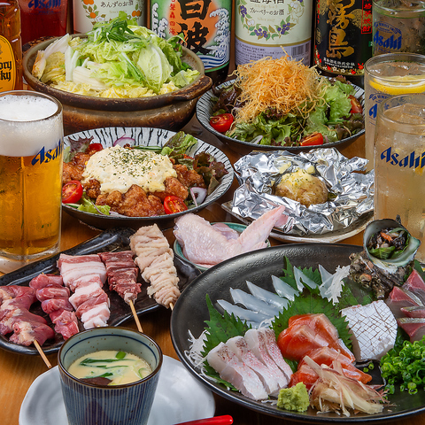 名物メニューの刺身や骨付き鳥をはじめ、焼鳥や一品料理、とりあえずのスピードメニューなど、絶品の居酒屋メニューを種類豊富にご用意いたしております。お料理と相性抜群のお飲み物もビールやハイボール、ワイン、焼酎、日本酒、カクテルなどバラエティー豊かに取り揃えております♪