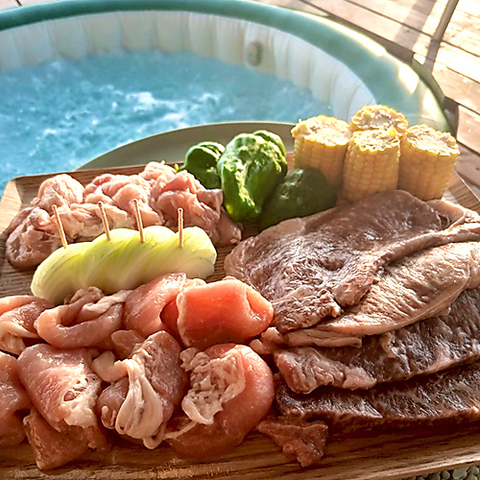 江ノ島の海を眺めながら楽しめる、ルアナハレのスタンダードBBQコース!牛カルビや豚ロース、鶏もも肉に加え、旬の野菜も充実。2時間飲み放題付きで税込5,500円!