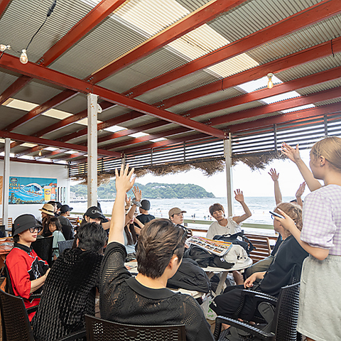 江ノ島西浜の海の家「ルアナハレ」は、目の前に広がる絶景オーシャンビューが魅力。カップルにおすすめの特等席もあり、海を眺めながらロマンチックなデートが楽しめます。