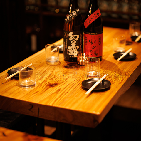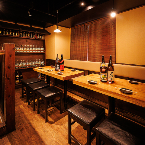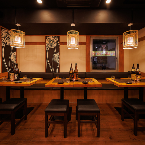 木の質感と間接照明が心地よい和の空間。風情あふれるテーブル席で、丁寧に仕込まれた逸品料理をお楽しみいただけます。やきとんや馬刺しを囲みながら、仲間と過ごす贅沢な時間をご堪能ください。飲み放題付きコースでさらに満足度アップ◎