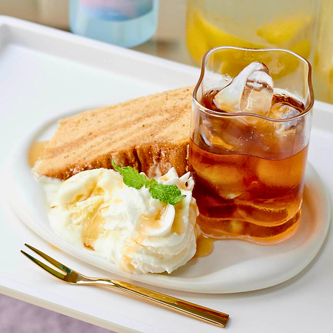 オリジナルのフルーツをたっぷりと使った甘い夢のような味わい。ふわふわの生地に、さまざまな果物の風味が溶け込んで、口に入れると幸せいっぱいに。アールグレイアイスティー付きです。