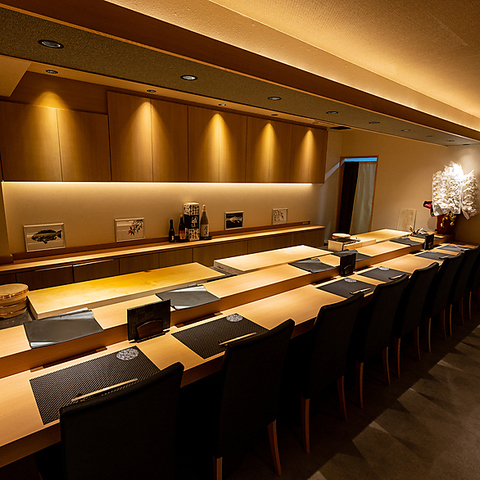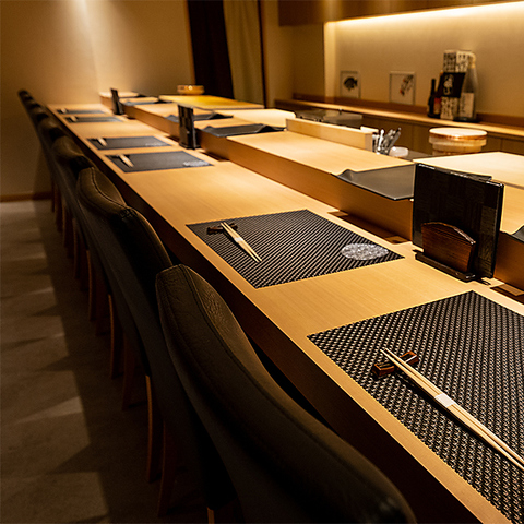 伝統と現代が交差する端正なカウンター席をご用意しております。精緻で端正な空間で、鮨を味わうひとときは、伝統的な手仕事の真髄や物流の発展について思いを馳せる機会ともなります。記念日や誕生日、接待など、特別な日を彩るのにふさわしい場所です。心ゆくまでご堪能ください。