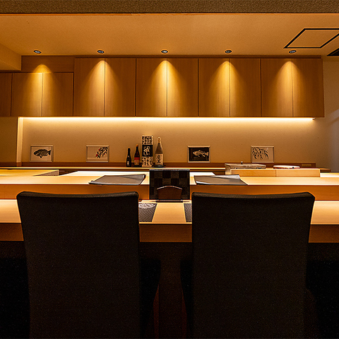 カウンター席をご用意しており、おひとり様や少人数のお客様に最適です。伝統と現代が交差する端正な空間で、精緻な鮨を味わうことで、手仕事の真髄や物流の進化について思いを馳せることができます。特別なひとときをお過ごしください。