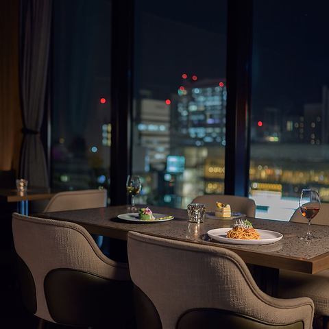 栄の街を一望できる全面ガラス張りの開放的な店内。ディナーは夜景を望みながらロマンチックな雰囲気に