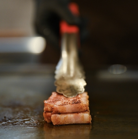 【鉄板焼きのライブ感】目の前で焼き上げる鉄板料理。焼ける音、立ち上る香り、ライブ感あふれる調理風景。五感で楽しめる、記憶に残る鉄板焼きです。