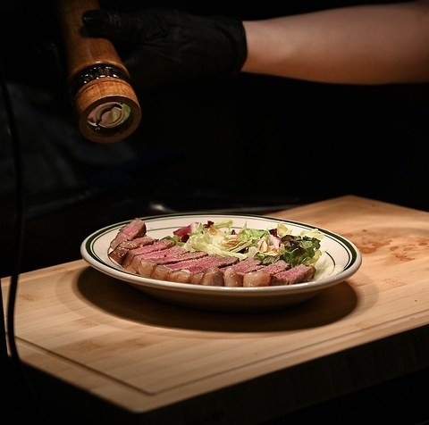 ジュワッと焼き上げたリブキャップステーキ200g。香ばしいメイラード香と肉汁あふれるジューシーさが自慢の大人気コースです。前菜・スープ付きで、贅沢なひとときをお楽しみください。