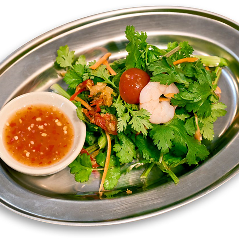 爽やかな香りのパクチーをたっぷり使ったサラダ。シャキシャキ野菜と一緒に、エスニックな味わいをお楽しみください。
