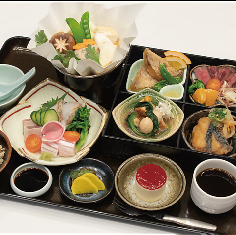 松花堂弁当の器に季節の料理を美しく盛り付けた、彩りも鮮やかな「松花堂ランチ」をぜひご賞味くださいませ