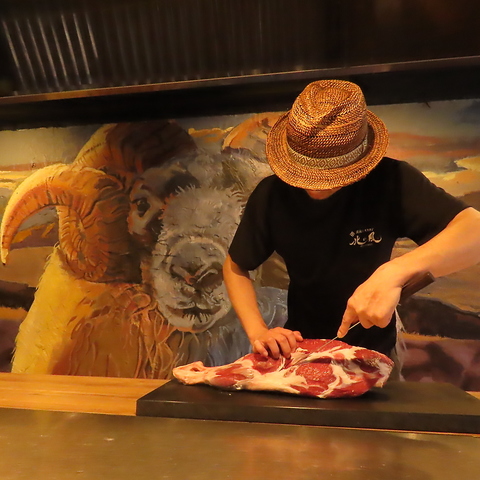 カットマイスターがご注文ごとに羊肉を手切りし、焼きあがる香りや音と共に五感で楽しめます。