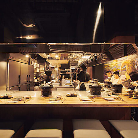 カウンター席は、お肉が焼ける香ばしい香りと共に、ライブ感あふれる楽しい食体験を演出します!壁のアートも目を引きます。