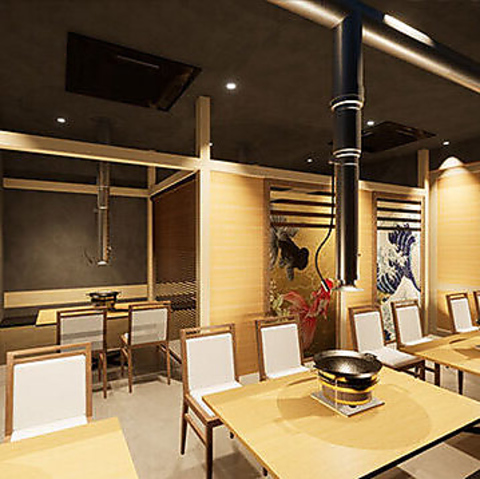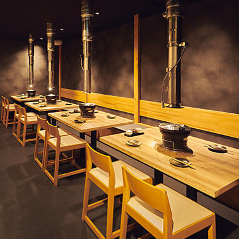 温かみのある木製テーブルと椅子が並び、各席に設置されたダクトで煙も気になりません。快適にお食事をお楽しみいただけます◎