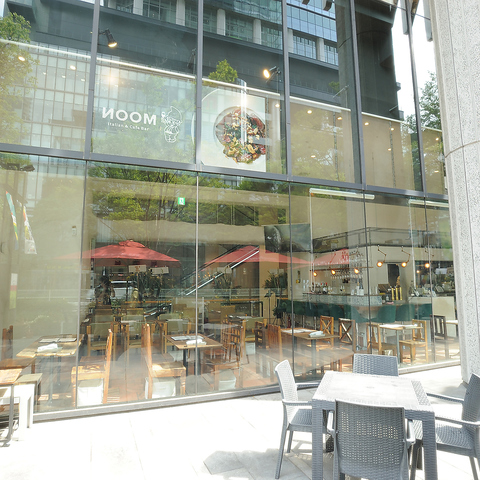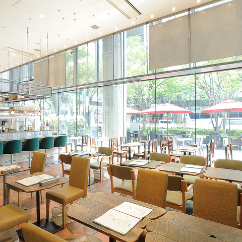 大きな窓からは外の景色が一望でき、開放感があります。店内のテーブル席で、街の喧騒を感じながらも、落ち着いた雰囲気の中でお食事の時間を楽しむことができます。