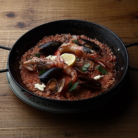 魚介たっぷりのシーフードパエリア、ベーコンの塩味に玉ねぎの甘み、トロッと温玉がたまらないトマトリゾットなど、身体も心も温まるパエリア・リゾットをご用意!※写真は一例です。