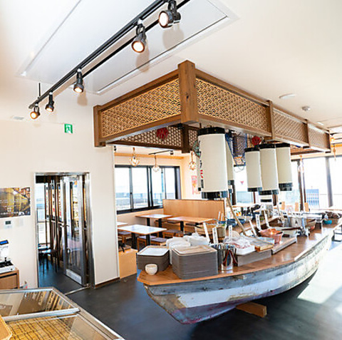 【至る所に船が!大人も子供も楽しいインテリアも見逃せない】店内のバイキング台や一部のお席に目を凝らすと、実際に漁に出ていた船がインテリアになっています。また至る所で海をイメージさせる内装にこだわり、まさに五感でお食事をお楽しみいただけます!