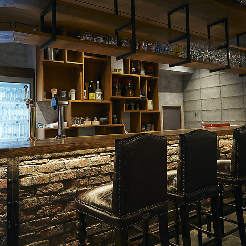 【BARカウンター】友人や仲間と語らうのにぴったりなカウンター席です。居心地の良い雰囲気の中で、特別なひとときをお楽しみください。美味しい一杯が待っています!