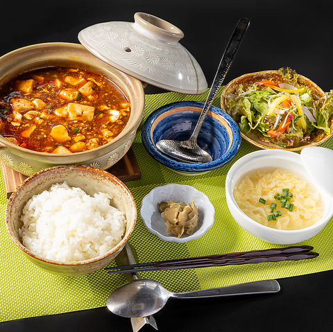 本格麻婆豆腐の定食です。奥深い辛味と痺れる旨味が食欲をそそります。土鍋で熱々に提供される麻婆豆腐は、ご飯との相性も抜群。新鮮な野菜サラダと優しい味わいの玉子スープ、箸休めのお漬物が付いた、満足度の高い一膳です。特製の香辛料が絶妙に調和し、食べるたびに旨味が広がります。ボリュームもあり、ランチにぴったり。※画像は一例です